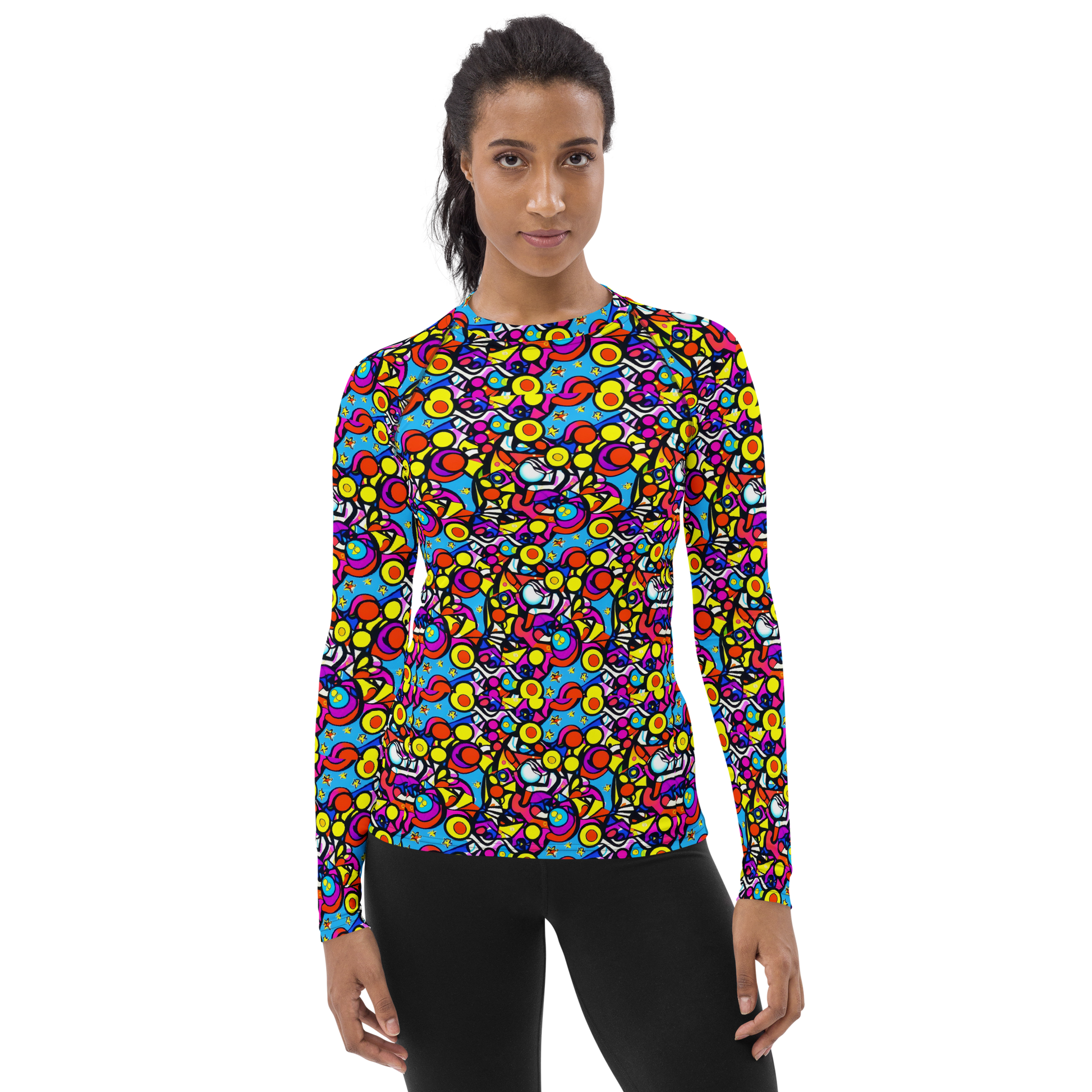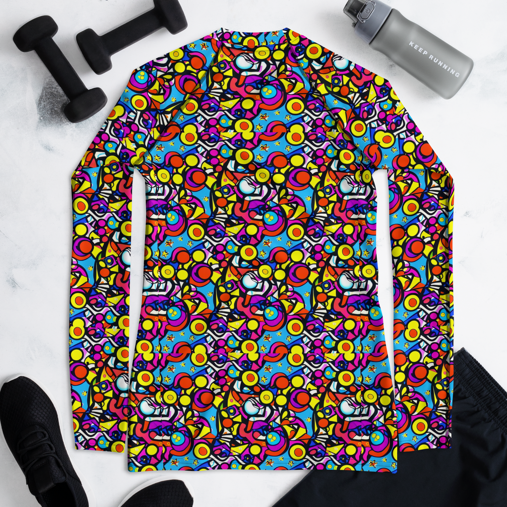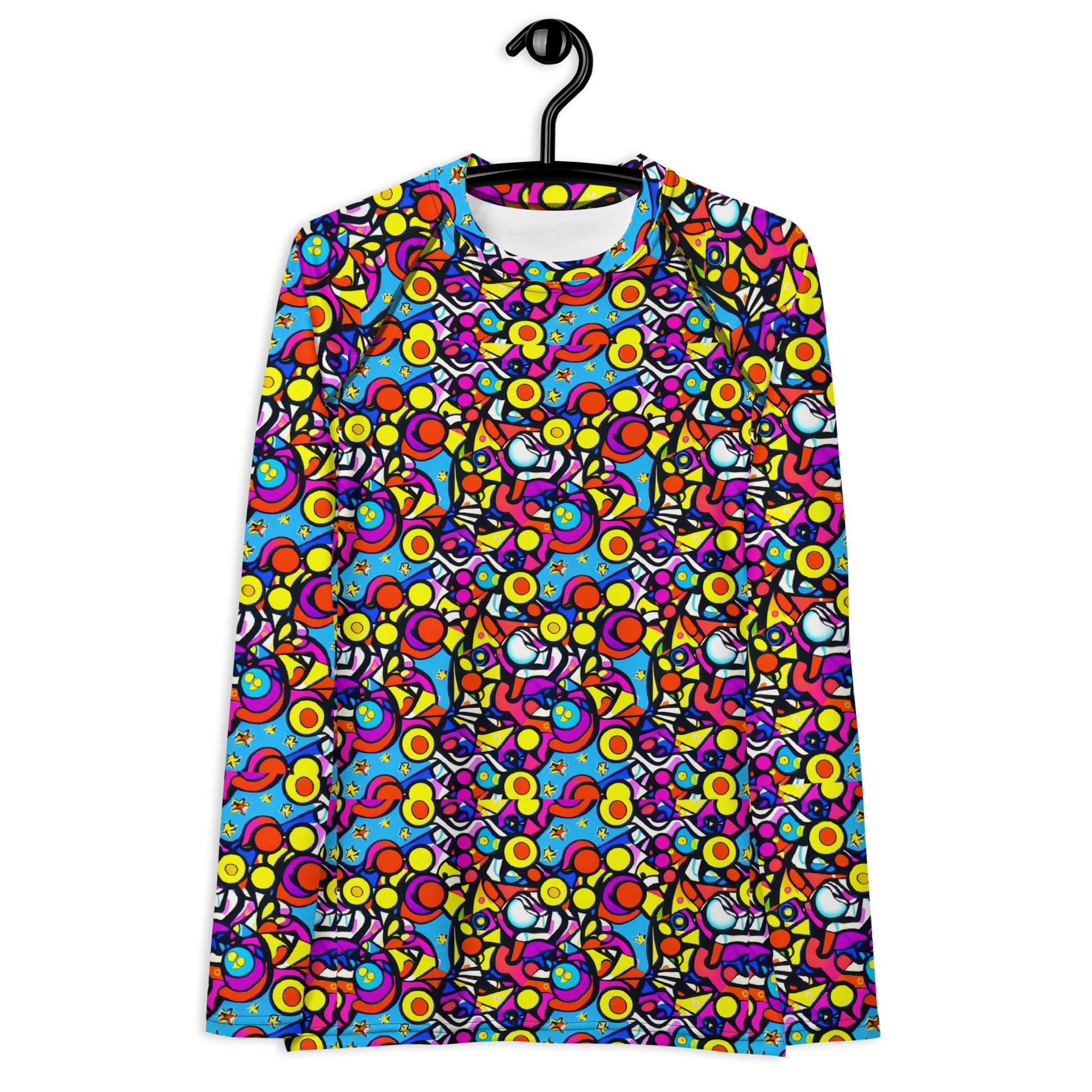 Dive into a universe of adventure with our long-sleeve rash guard, wrapped in the vibrant "Stellar Circus" design! This energetic pattern swirls with electric blues, vivid yellows, and hot pinks, capturing the essence of cosmic wonder with celestial motifs and playful geometry. It's the perfect companion for summer festivals, water sports, or any creative escapade, designed for the bold and imaginative at heart.