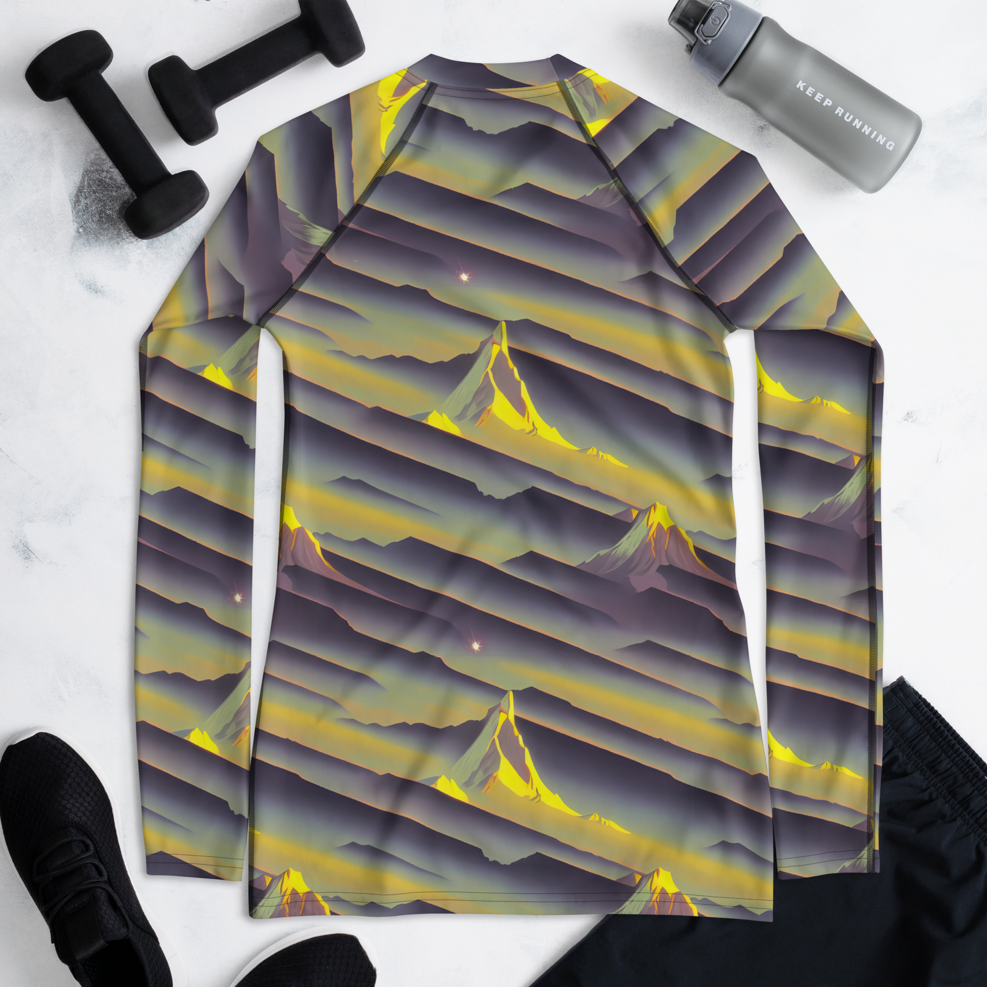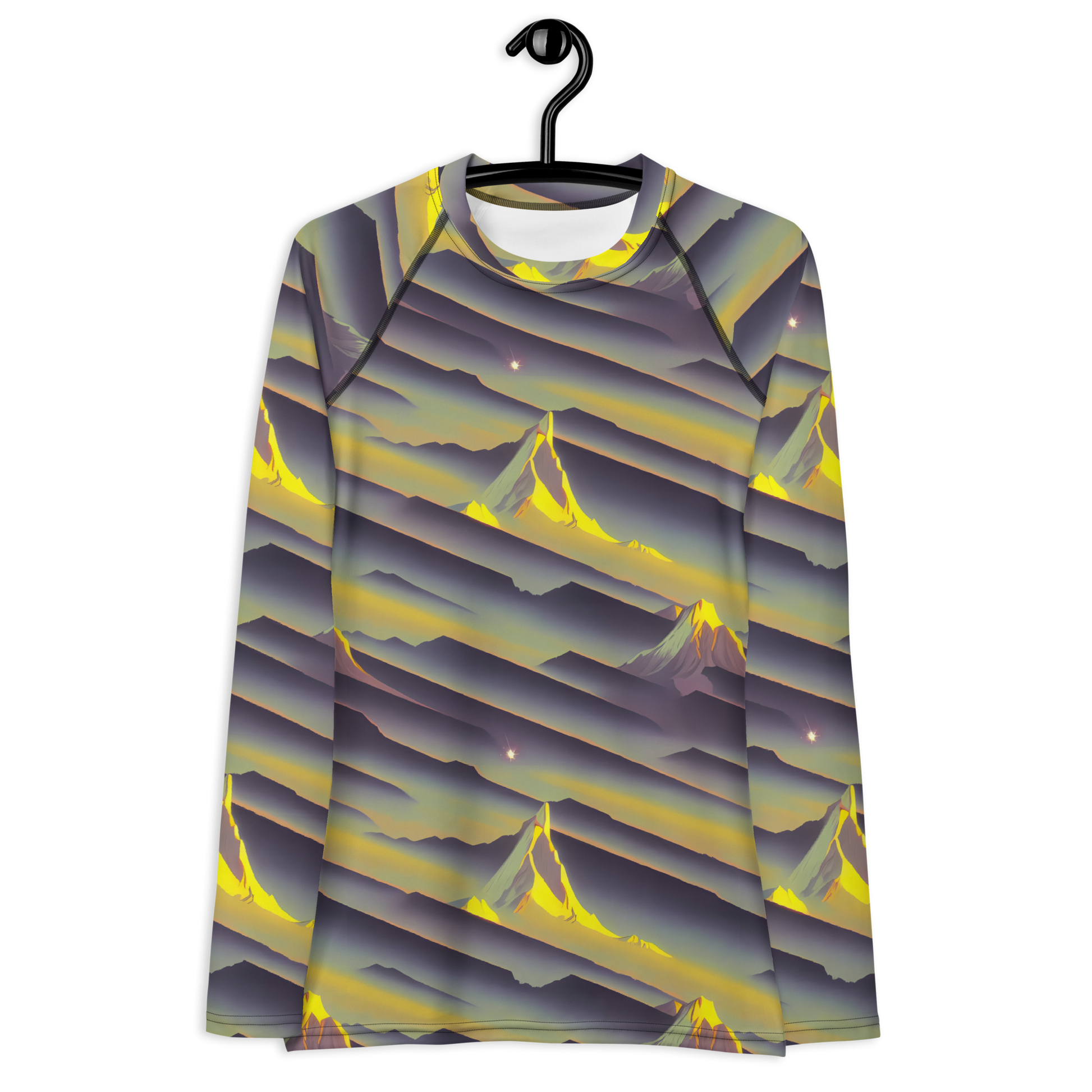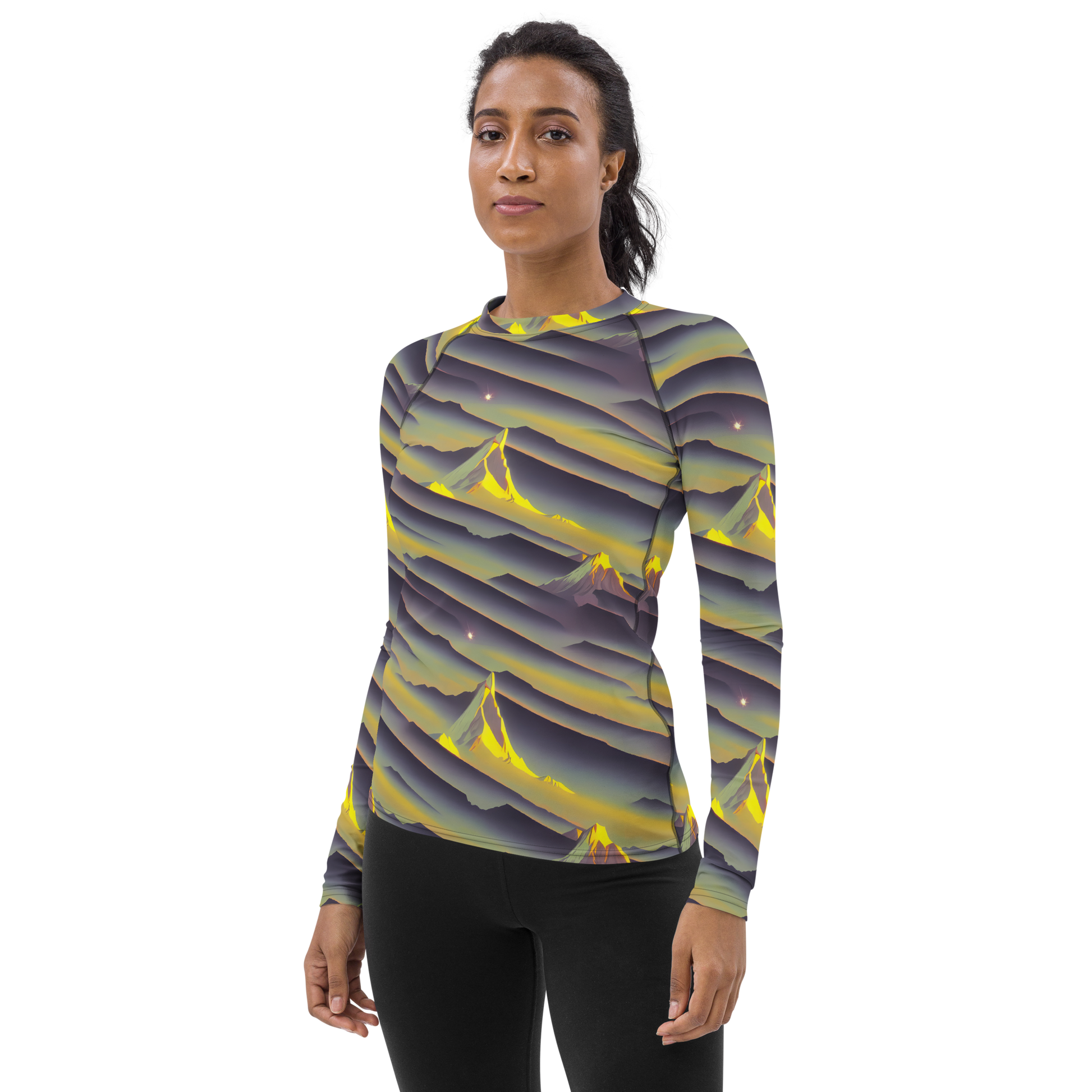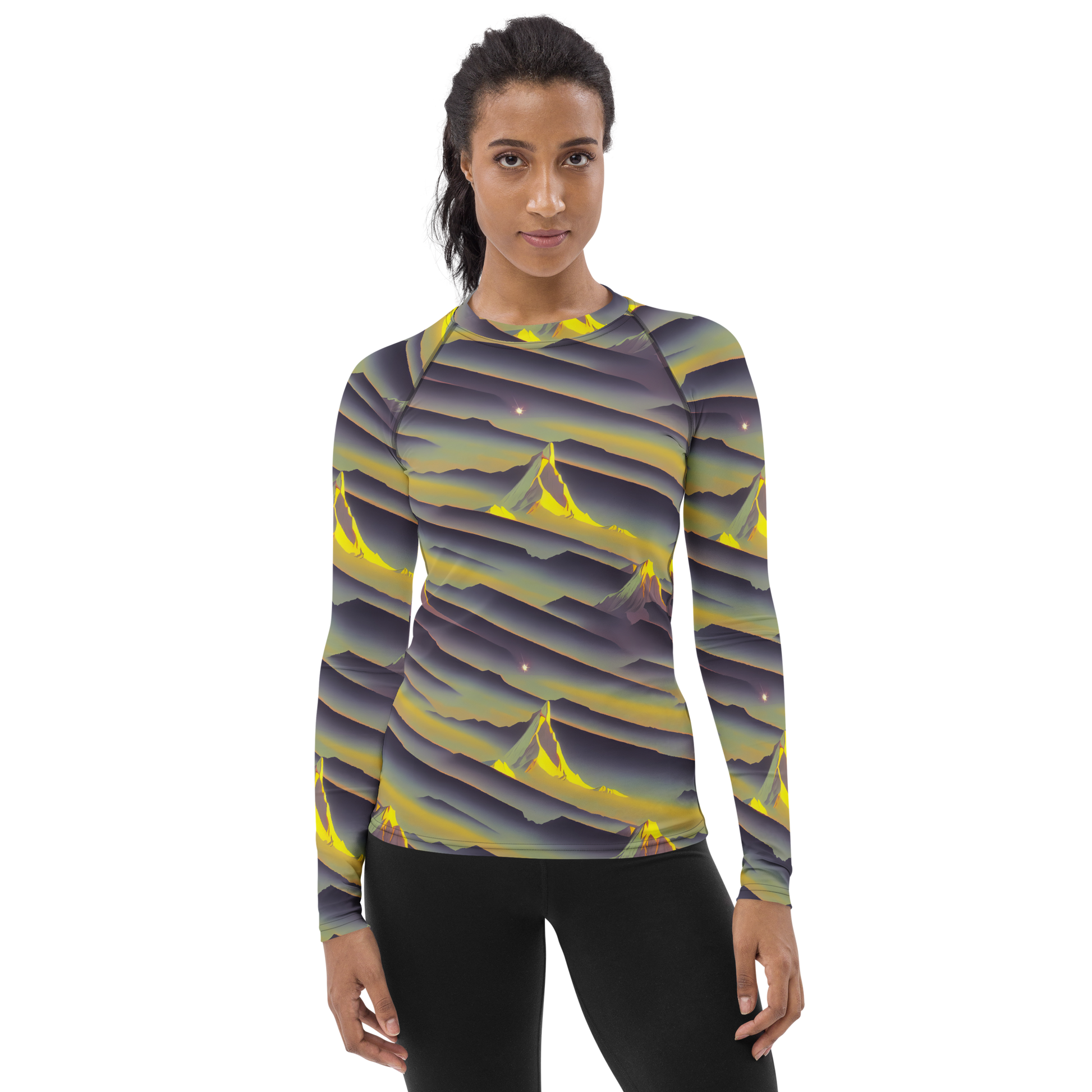 Experience the perfect blend of art and performance with our Women's Rash Guard, adorned with a mesmerizing landscape of stylized mountain peaks in bold geometric forms and sharp angles. The rich mustard yellows, deep purples, and soothing greys create a symphony of majestic tranquility, making this piece ideal for art events or casual outings in the cooler seasons. Crafted for the contemplative and adventurous soul, this rash guard ensures you stand out while staying protected and comfortable.