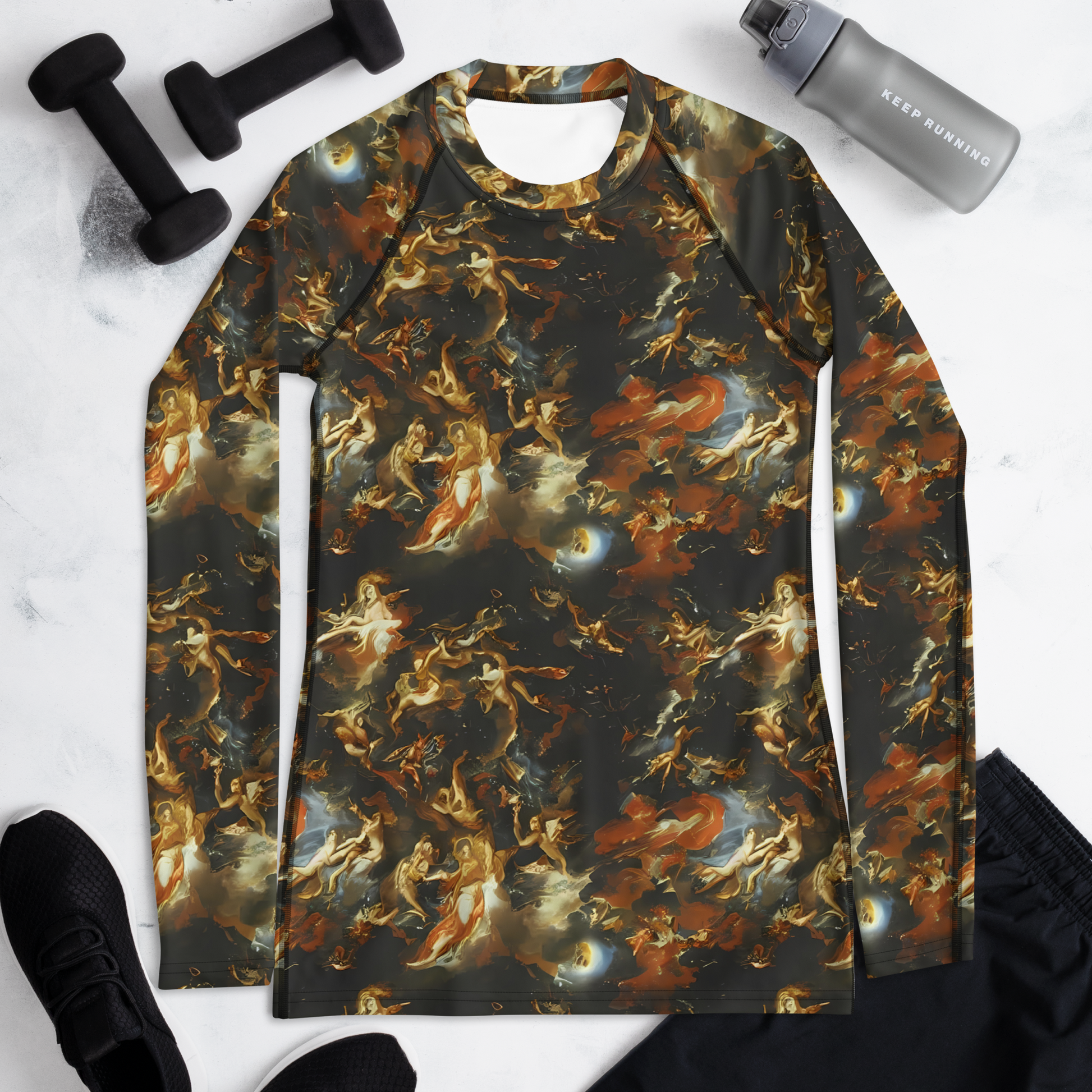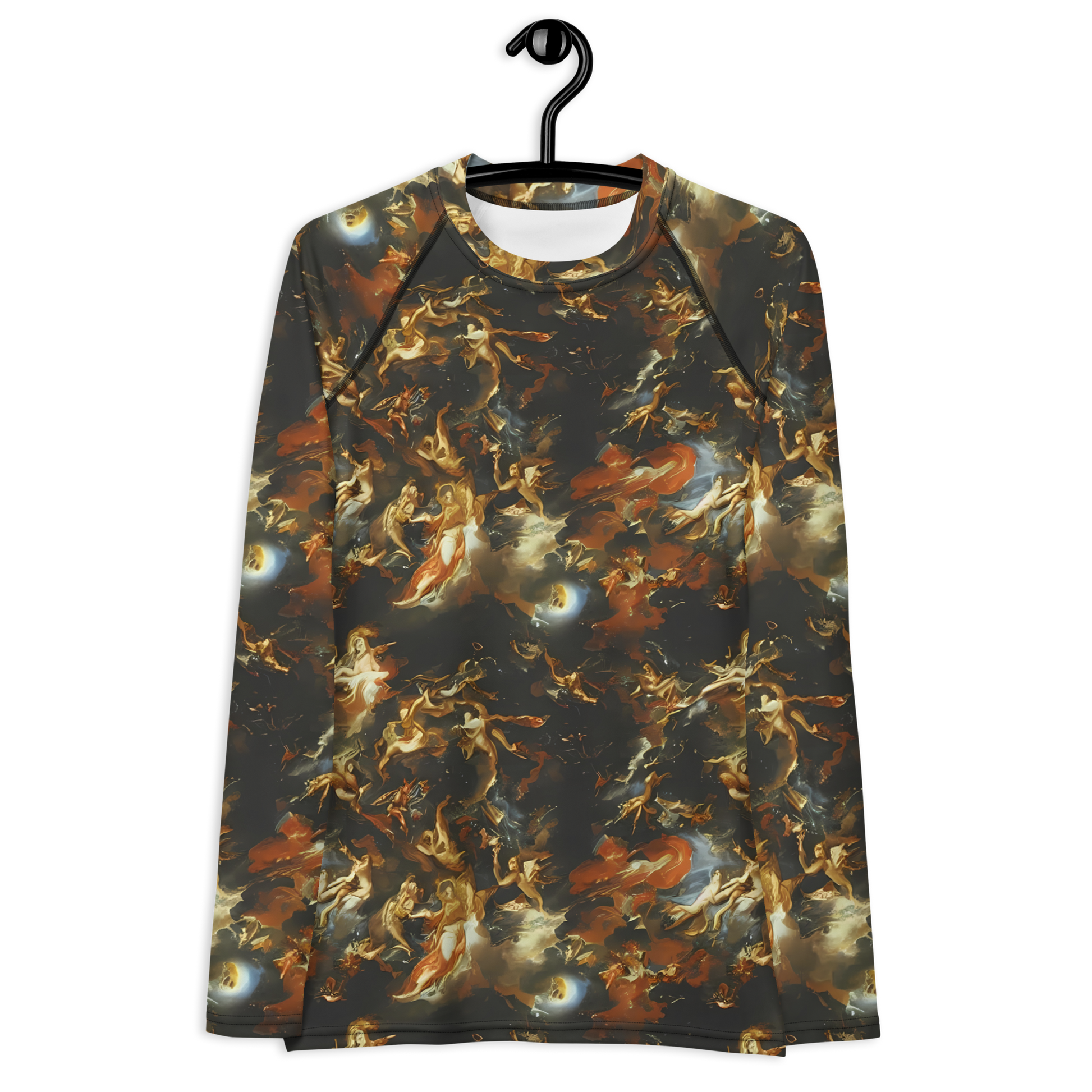 Step into a realm where fashion meets the cosmos with our luxurious long-sleeve rash guard, featuring the mesmerizing "Van Dyck Vortex" pattern. Wrap yourself in a celestial blend of golden, amber, and ebony swirls that dance across the fabric, reminiscent of Baroque grandeur interwoven with the enigmatic beauty of the universe. This rash guard isn't just a protective layer; it's a statement piece that speaks to the soul of art and adventure, perfect for making a splash at any evening event or while exploring the depths of the sea.