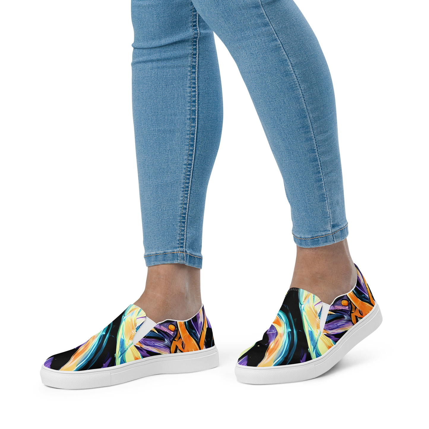 Embrace the essence of artistic elegance with our Women's Slip-On Canvas Shoes, featuring the enchanting "Dorothy's Whirl" pattern. These shoes are a masterpiece of comfort and style, with swirling shapes and a kaleidoscope of deep blues, purples, and radiant yellows and oranges that dance around your feet, capturing the essence of spring and summer vibrancy. Ideal for those who appreciate a touch of sophistication with their creative spirit, these slip-ons are your go-to for making a bold statement at any creative event or casual outing.