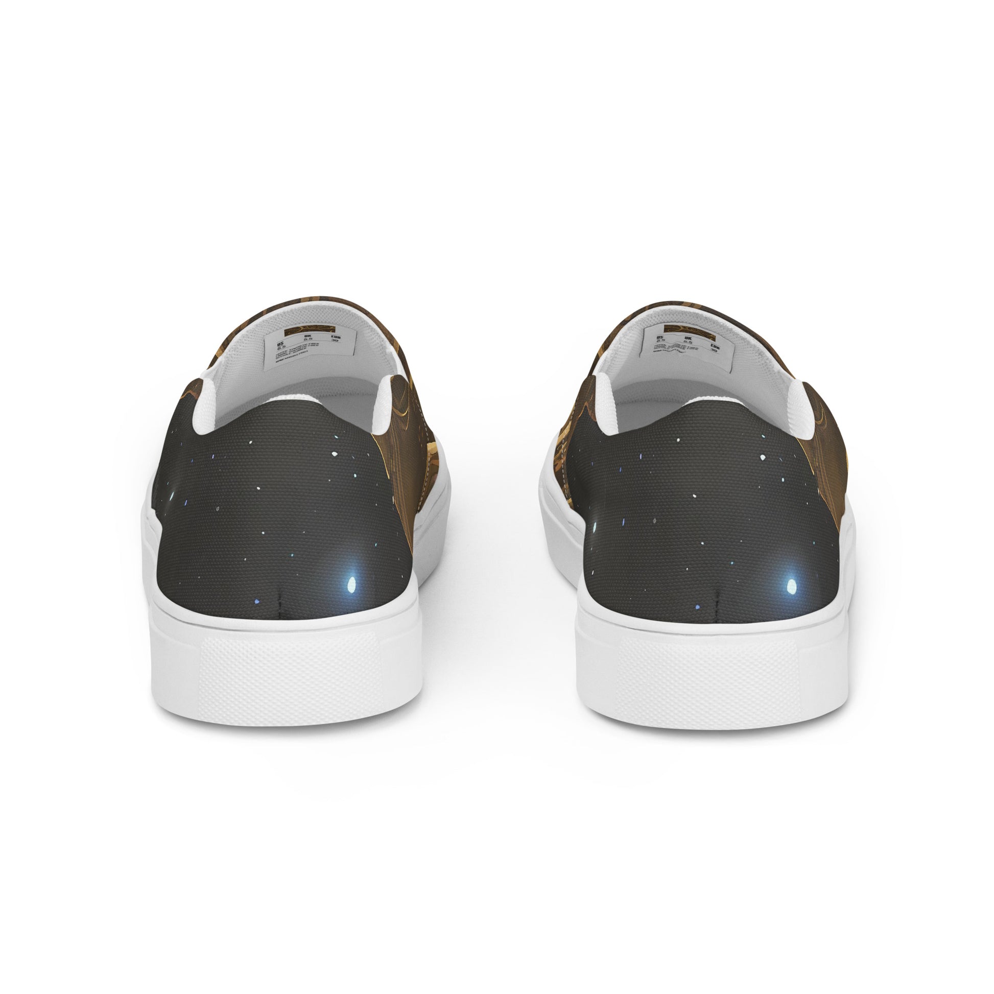 Elevate your footwear game with our Custom AI-Designed Women's Slip-On Canvas Shoes featuring the mesmerizing "Gilded Reverie" pattern! Each pair showcases a captivating blend of swirling golden motifs set against a deep, starry night backdrop, making every step feel like a stroll through a dream. Perfectly crafted for the fashion-forward, these shoes are not just a statement piece; they offer unparalleled comfort and versatility for any occasion.