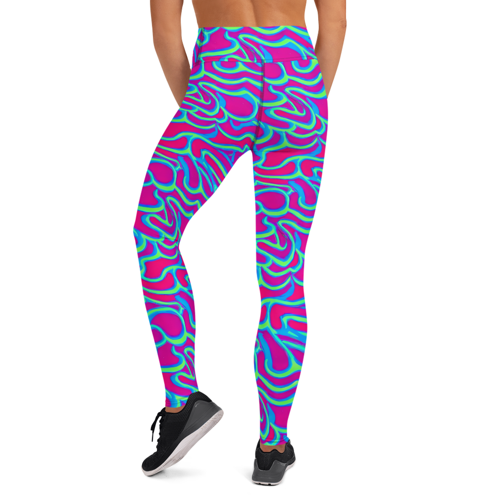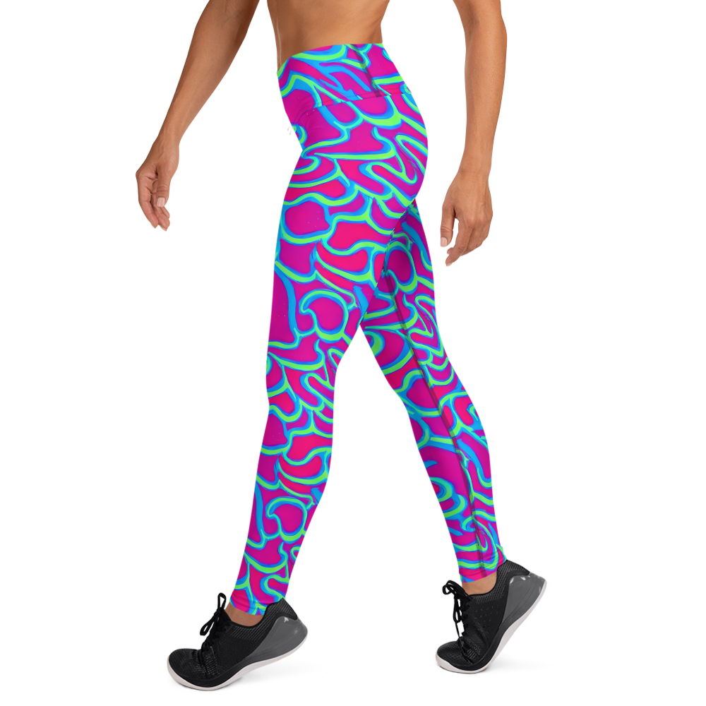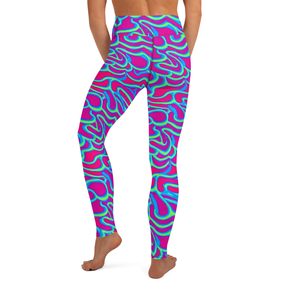 Ignite your yoga practice with our captivating yoga leggings, featuring a dazzling interplay of hot pink and electric blue that captures the essence of both water and flame. With swirling shapes and fluid lines, this design brings an electrifying sense of motion and energy to your wardrobe, making it perfect for those who desire to make a bold statement at summer festivals or while embracing their creative spirit.