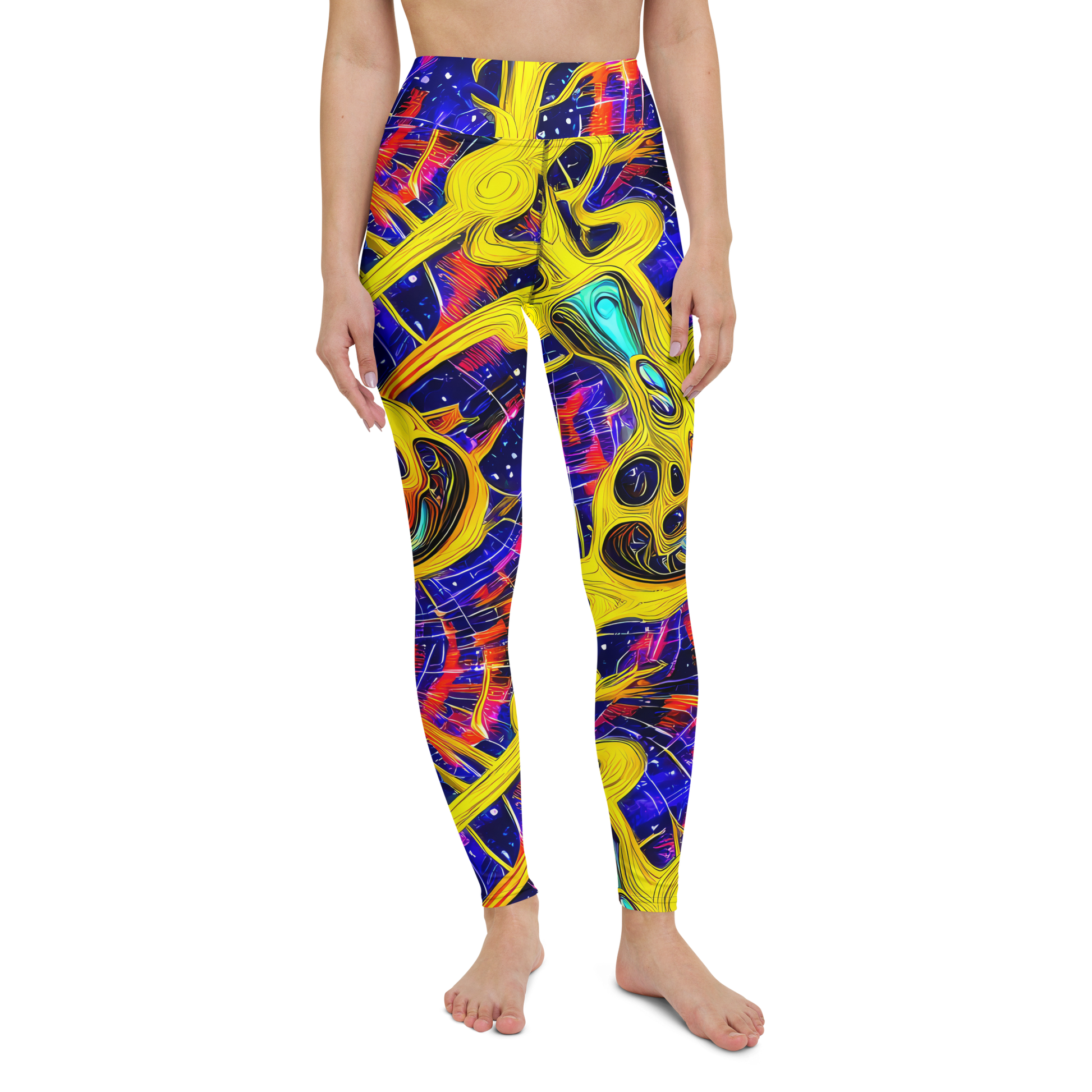 Unleash your inner artist with our AI-designed yoga leggings, featuring a vibrant pattern that bursts with electric yellow, deep blue, fiery red, and teal swirls. Inspired by baroque stage designs, these leggings are perfect for making a bold statement at art openings, music festivals, or stylish evening events. Feel the energy and avant-garde vibe as you flow freely in the epitome of softness and flexibility!